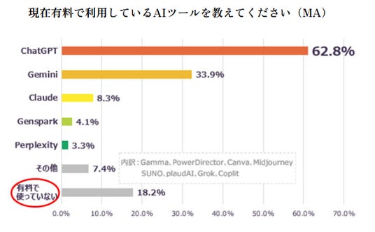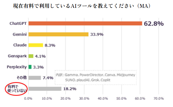 回答者の8割以上が有料版を利用。ChatGPT(62.8%)を筆頭に有料でAIツールの活用が進んでおり、