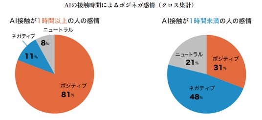 AI接触が1時間以上の人ほど、AIの未来をポジティブに捉え(81%)1時間未満の層は、ネガ