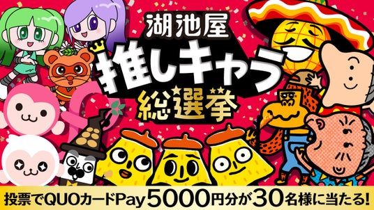 「湖池屋GOGO!ランド」の開設を記念し、「湖池屋推しキャラ総選挙」を実施中!本企画では、湖池屋を代表する9キャラクターの中から、ファンのみなさまの投票によって1位を決定します。投票にご参加いただいた方全員に、サイト内で使用できる「100ポテマイル」をプレゼント。さらに、抽選で30名様には「QUOカードPay 5,000円分」が当たります。