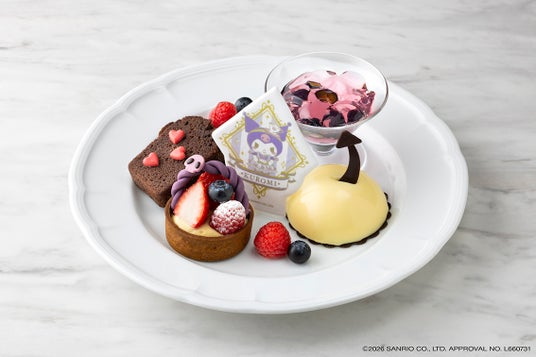 「クロミデザートプレート」は、苺やラズベリー、ブルーベリーをカスタードクリームの上に飾って花かごに見立てたフルーツタルトや、ブルーベリーのジュレをレアチーズのムースで包んで「クロミ」をイメージしたケーキなど、程よいフルーツの酸味とコクのある甘さ、さらに食感も楽しめる一皿に仕上げました。