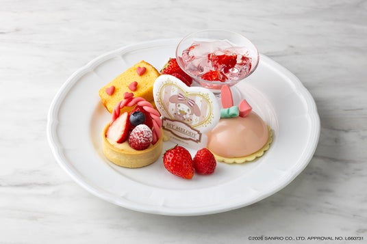 「マイメロディデザートプレート」は、苺やラズベリー、ブルーベリーをカスタードクリームの上に飾って花かごに見立てたフルーツタルトや、苺とラズベリーのジュレを苺のムースで包んで「マイメロディ」をイメージしたケーキなど、見た目の可愛らしさにプラスして、味わいのバランス、食感にもこだわりました。