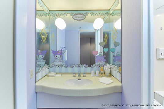 窓側やバスルーム、クローゼットの鏡など各所にも「クロミ」のデザインが溢れ、世界観に浸ることができます。さらに、お部屋に設置された額縁の中の、複数の作品をお楽しみいただけます。