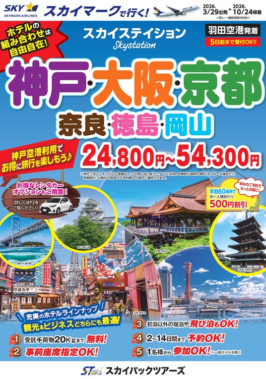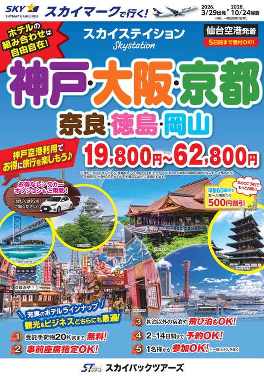 スカイパックツアーズ株式会社(本社:東京都中央区、社長:横山正巳)は、スカイマークの航空券とホテルがセットになったスカイマーク公式・旅行商品(ダイナミックパッケージ)『たす旅』の各地発の「神戸空港就航20周年記念」クーポンキャンペーン 第二弾の販売を開始しました。