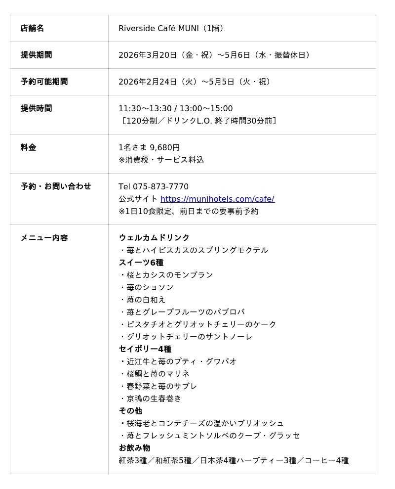 京都・嵐山のスモールラグジュアリーホテルMUNI KYOTO(所在地:京都市右京区嵯峨天龍寺芒ノ馬場町、総支配人:粂野 隆史)は、渡月橋と桂川を望む特等席をご用意する「Riverside Cafe MUNI(リバーサイド カフェ ムニ)」において、春の訪れを五感で味わう「Riverside Afternoon Tea ~le Printemps~ (リバーサイド アフタヌーンティー ル・プランタン)」を、2026年3月20日(金・祝)~5月6日(水・振替休日)までの期間限定で提供いたします。