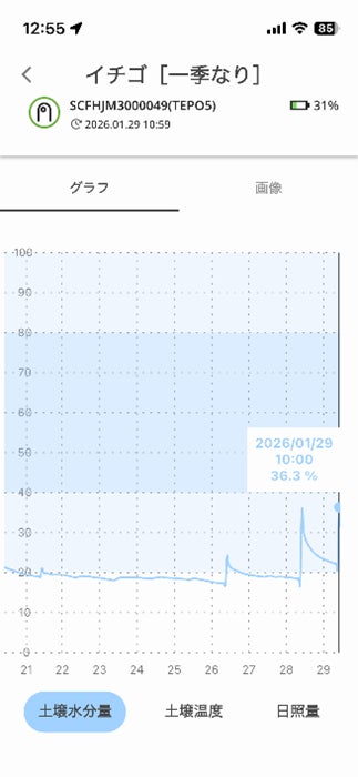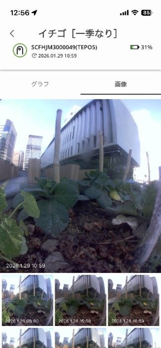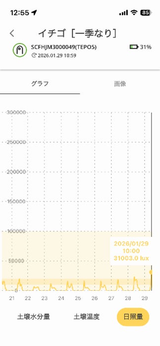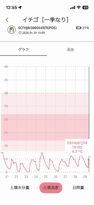 さらに、grow CONNECT にはカメラが搭載されているので、栽培している野菜や田んぼの様子が画像で見れるだけではなく、「土壌温度」「土壌水分量」「外気温」「日照量」などのグラフが表示され、日々の栽培の目安にもなります。