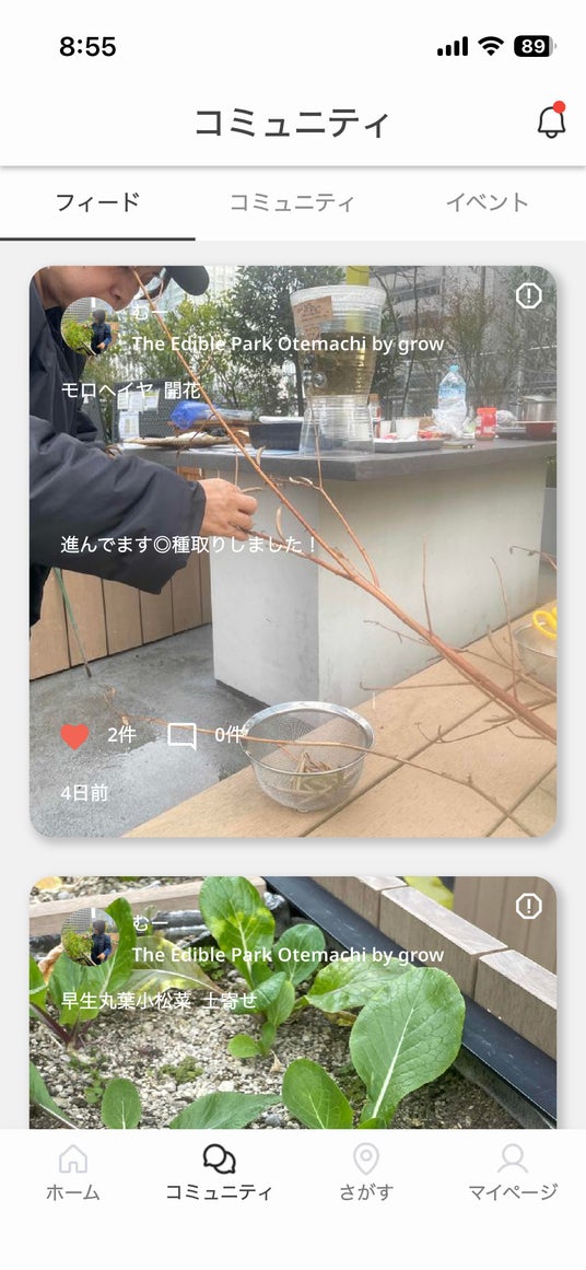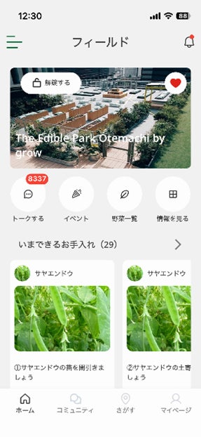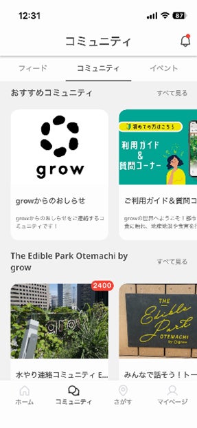grow アプリは共同・コミュニティ型栽培に特化したアプリで、MAP から近くの農園をすぐに探して、フォローしたり、メンバーになることが出来たり、参加してる農園のメンバー同?でのコミュニケーションや、イベントへの参加、さらにはお手入れをすることでポイントが貯まったりと、コミュニティ農園での日々のやりとりをたのしくしてくれます。