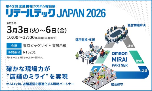 2026年3月3日(火)から3月6日(金)までの4日間、東京ビッグサイト(東京都江東区)で開催される「リテールテックJAPAN2026」にオムロンフィールドエンジニアリング株式会社、オムロンソーシアルソリューションズ株式会社、オムロン株式会社の3社でブース出展いたします。