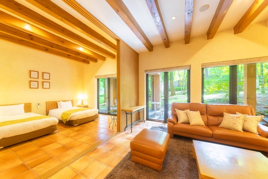 フジプレミアムリゾートには、ファミリーやグループでの滞在におすすめな〔ホテルスポルシオン〕と1棟ずつ異なる間取りやデザインのラグジュアリータイプの〔フォレストヴィレッジ〕があり、すべての客室が60平方メートル 以上と広々とし、〔ホテルスポルシオン〕と〔フォレストヴィレッジ〕のそのそれぞれに愛犬と滞在できる専用の客室を備えております。