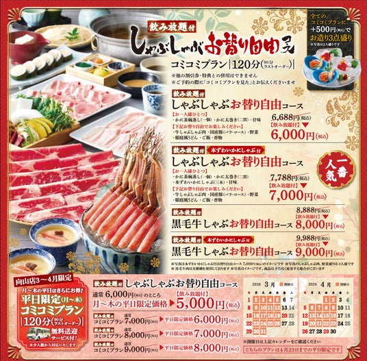 株式会社物語コーポレーション(本社:愛知県豊橋市/代表取締役社長:加藤 央之)が埼玉県と愛知県に展開する『しゃぶとかに 源氏総本店』は、2026年5月下旬までの期間、飲み放題付きの「歓送迎会プラン」をご用意しました。ご予約は店頭または、お電話にて承ります。