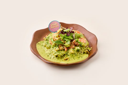大人気メニュー「桃太郎焼き」に濃厚なアボカドクリームソースと、プリプリのエビをふんだんに使用したヘルシーな一品。