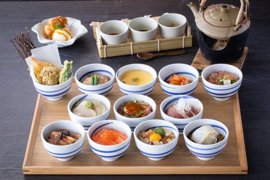 烏賊や平貝をはじめ、鯛の昆布〆、本鮪の湯引き漬けなど、趣向を凝らした7種のミニ海鮮丼を主役に、茶碗蒸しや天婦羅、金星豚の角煮を組み合わせた御膳です。小ぶりの丼は、それぞれに主役となる魚介を盛り込み、彩り豊かな一膳に仕立てました。漬けや炙り、卵黄漬けを添えた丼など、異なる味わいをご堪能いただけます。