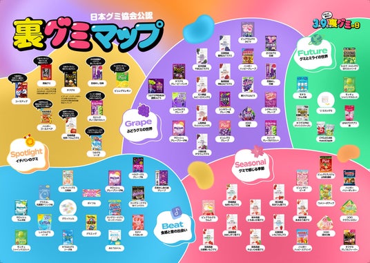 今回のマップではソフトやハードだけでは語れないグミの魅力の裏側がわかる5つの切り口をご紹介!主要メーカーのグミを横断型で網羅しており、ここでしか楽しめないマップとなっています。