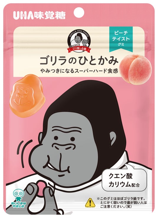 人気健康家電「ゴリラのひとつかみ」とUHA味覚糖がコラボして誕生した「ゴリラのひとかみ ピーチ味」。家電量販店を中心に販売されて注目を集めましたが、今回、セブン‐イレブンで再登場します。噛む力が人間の約10倍とされるゴリラでさえ、噛み応えを感じられるハード食感をイメージして作られたグミ。この機会にぜひ「ゴリラ級」をご体験ください。