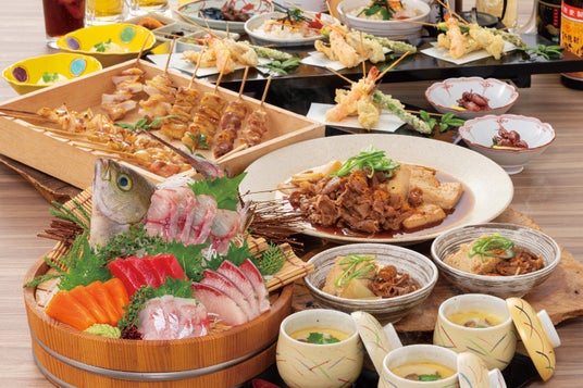 また、気の置けない仲間と気軽に飲むなら「粋な横丁コース」(3,980円)がお得。三大名物の「刺身」「煮込み」「焼きとり」など、お酒にピッタリの全7品を揃えます。大切な方たちとの会食には、「和の伝統コース」(5,500円)がオススメ。自慢の「刺身」「煮付け」に加え、土鍋の「炊き込みご飯」など、板前の手仕事を存分に堪能できる全8品です。さらに、すべての宴会コースは「アサヒスーパードライ」樽生ビールを含む飲み放題付き。加えて、ひとりたったプラス500円で蔵元直送の銘酒「浦霞 本仕込 本醸造」「初孫 魔斬 生? 純米 本辛口」「澤乃井 純米 大辛口」の日本酒3銘柄も飲み放題で楽しめます。