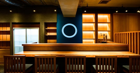 中央に配置されたドットのエンブレム。モダンで落ち着きのあるカウンター席。