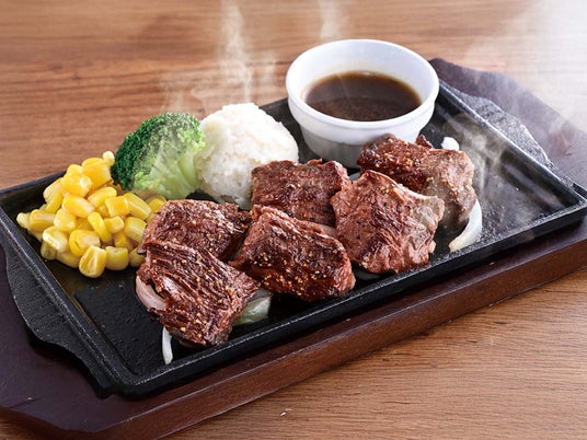 熱々!牛ハラミステーキモ~烈な旨さ!人気の“牛ハラミステーキ”がリニューアル。鉄板から立ちのぼる煙と香ばしい香り、あふれ出す肉汁に誰もが釘付け。さらに肉厚ジューシーな食べ応えにパワーアップして再登場。
