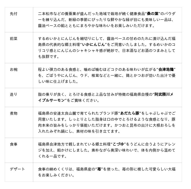 八寸では、いわき市の「市の魚」にも認定されている、皮が薄くふんわりとした柔らかい食感の“メヒカリ”を、骨ごと召し上がっていただけるように唐揚げにしてご用意いたします。サラダでは、濃厚な旨みと肉厚な身の“ヤナギダコ”を、春らしく桜風味のドレッシンに合わせました。焼物では、塩麹に漬けてより柔らかく旨みが引き出された会津地鶏と、みずみずしい中にコクのある福島県産のかぶをお楽しみいただけます。福島県産のあおさを練り込んだ厚揚げの煮物や、バター醤油で焼いた阿武隈川メイプルサーモンの身をほぐしたご飯、福島県産の苺ゼリーなど、ランチでも魅力溢れる食材をしっかりと感じていただる御膳になっています。