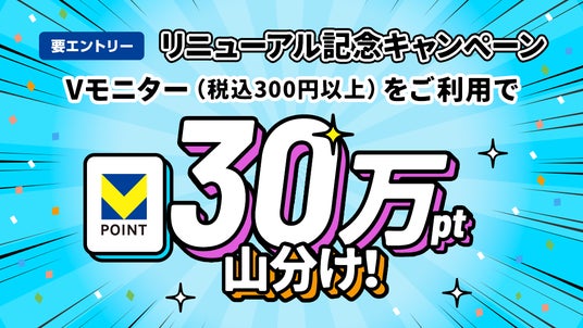 本リニューアルを記念し、2026年2月24日(火)から3月24日(火)までのあいだ、『Vモニターリニューアル記念キャンペーン』を実施いたします。期間中に本キャンペーンにエントリーのうえ、Vモニターにて1回あたり税込300円以上をご利用いただき、謝礼のVポイント獲得が完了した方全員を対象に、Vポイント30万ポイントを山分けしてプレゼントいたします。さらに、期間中にVモニター利用規約に同意のうえ利用を開始された方の中から253名に、抽選で10,000ポイント・1,000ポイント・100ポイントのいずれかを進呈いたします。ぜひこの機会にVモニターをご体験いただき、お得なキャンペーンにご参加ください。