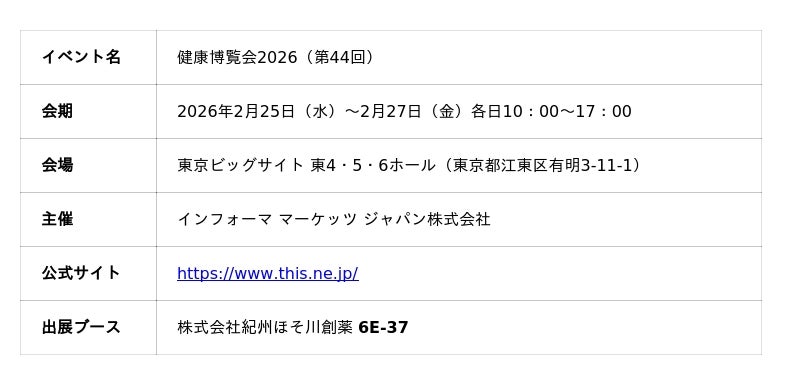 株式会社紀州ほそ川創薬(和歌山県)は、2026年2月25日から開催される「健康博覧会2026」に初出展し、注目素材である八升豆(国産ムクナ豆)を紹介します。L-ドーパを豊富に含み、“実写版仙豆”として話題の天然素材を、国内シェアNo.1※の供給体制でご提案。OEM・サプリ開発に新たな可能性をお届けします。2025年から、原材料仕入に関する問合せが急増するなど、市場からの関心がますます高まる八升豆をぜひブースでご体感ください。