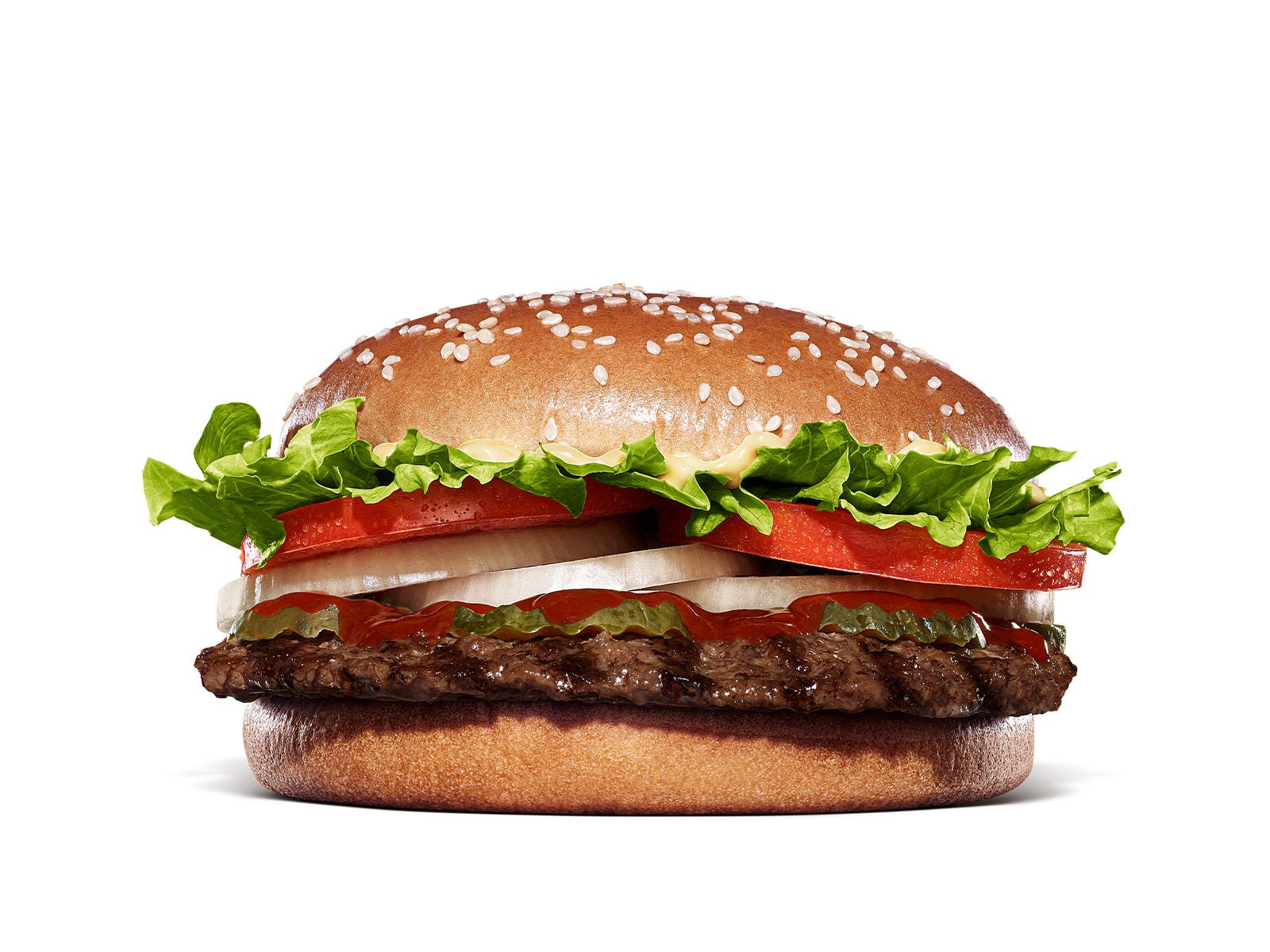 直火焼きの100%ビーフパティ、新鮮なレタス、トマト、オニオン、味のアクセントのピクルスを新しくなった「特製スパイシーソース」で仕上げました。