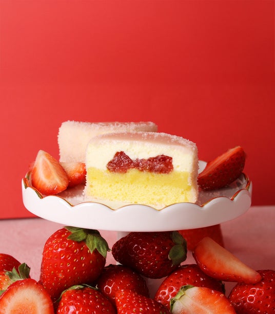 スポンジの上に、スイートポテト生地となめらかなマスカルポーネを重ね、あまおう苺のジャムを挟み込みました。あまおう苺の華やかな酸味と、なめらかなマスカルポーネ、さつまいものやさしい甘さが調和した、ふわっと上品なティラミス。いちごミルクのグラサージュにピンク色のケーキクラムを散らし、お花畑のような可愛らしさを演出しています。※要冷蔵