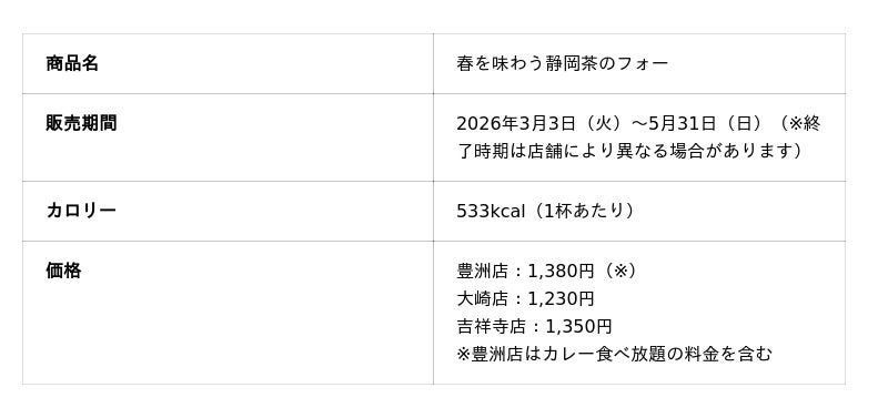 シマダハウス株式会社(東京都渋谷区、代表:島田一成)が運営する国産米麺フォー専門店 COMPHO(コムフォー) は、春の期間限定メニュー 「春を味わう静岡茶のフォー」 を、2026年3月3日(火) より販売いたします。