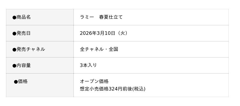 株式会社ロッテ(東京都新宿区、代表取締役社長執行役員:中島英樹、以下ロッテ)は、2026年3月10日(火)に「ラミー 春夏仕立て」を発売いたします。チョコレートと特製ラムレーズンがとけあうおいしさが楽しめる、洋酒チョコレート市場NO.1(※)のラミーは、長らく冬季限定として親しまれてきましたが、かねてより「一年中ラミーが食べたい!」と熱いご要望をいただいておりました。年間を通じてラミーのおいしさをお届けすべく研究を重ね、発売60周年を経て、ついに春夏仕立てのラミーが完成いたしました!「ラム酒そのものを軽やかに楽しむ」をテーマに春夏にもぴったりな味わいに仕立てました。とろっと特製ラムレーズンとチョコがとけあう“今だけの”ラミーの味わいをぜひお楽しみください。