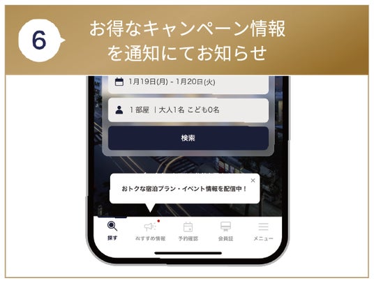 ホテルから「おトクなプラン」や「おすすめ情報」などが配信されます。配信されるとアプリ下部の「おすすめ情報」に赤いマークでお知らせいたします。