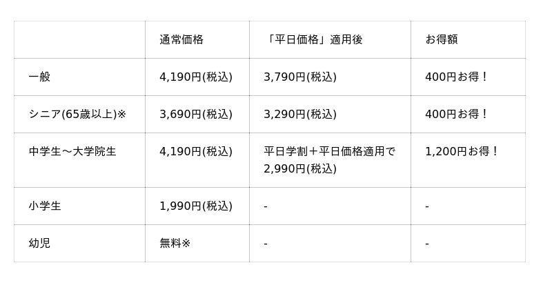 ●「平日学割」は学生証ご提示の本人に限り有効です。「平日価格」・「平日学割」はキャンペーン開催期間中の土日・祝を除く平日のみが割引適用となります。「平日価格」の対象は一般・シニア料金のお客様です。