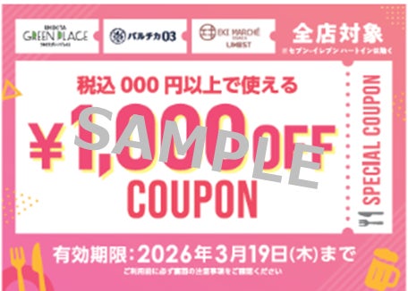 対象3施設内の店舗で利用可能な「1,000円OFF」、「500円OFF」、「200円OFF」クーポン