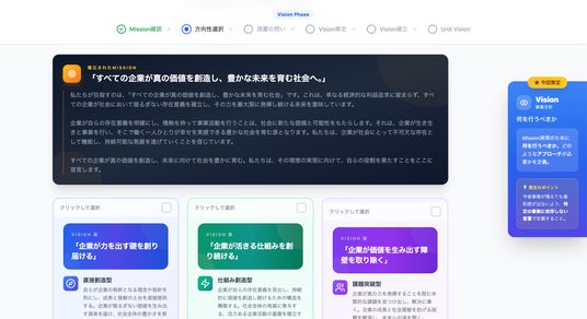 Mission(存在意義)→ Vision(事業方針)→ Value(価値観)の順に、段階的に策定を進められます。各フェーズは独立して購入でき、必要なフェーズだけを利用することも可能です。複数事業を展開する企業向けに、全社Visionとの整合性を保ちながら事業ごとのVision(Unit Vision)を策定する機能も備えています。