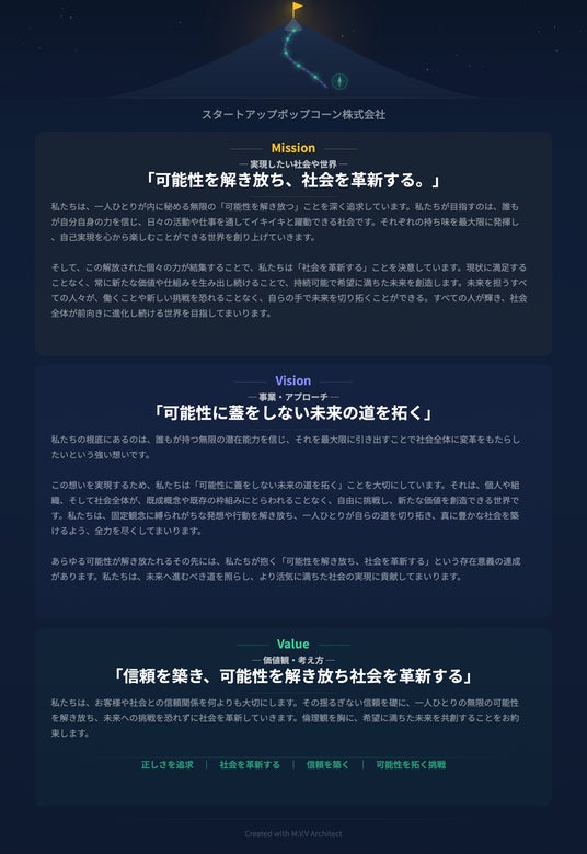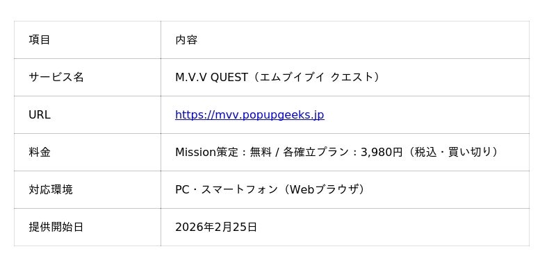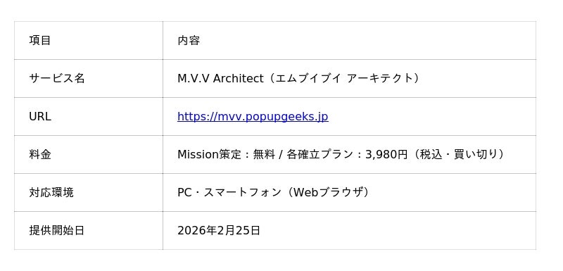 スタートアップポップコーン株式会社(本社:福岡県飯塚市、代表取締役CEO:澤田 聖士)は、AIとの対話を通じて企業のMission(存在意義)・Vision(事業方針)・Value(価値観)を策定できるWebサービス「M.V.V Architect」( https://mvv.popupgeeks.jp )を2026年2月25日に正式リリースいたしました。Mission策定(5ステップ)は完全無料でご利用いただけます。