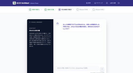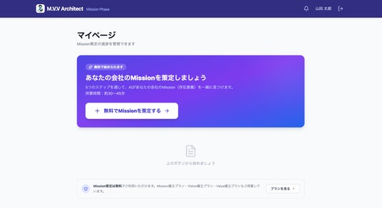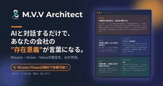 M.V.V Architectは、すべての経営者が「自社が社会に存在する理由」を自分の言葉で見つけられるように開発いたしました。AIとの対話を通じて、経営者ご自身も気づいていなかった本当の想いが言葉になっていきます。Mission策定は無料で始めていただけます。経営理念は、一部の大企業だけのものではありません。社会をつくろうとするすべての経営者のためのものです。