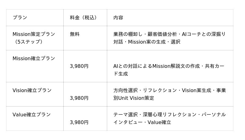 1. Mission策定は完全無料、すぐに始められるGoogleアカウントで登録後、すぐにMission策定を開始できます。業務の棚卸しから顧客価値の分析、AIとの深掘り対話、Mission案の生成・選択まで、5ステップすべてを無料で体験いただけます。