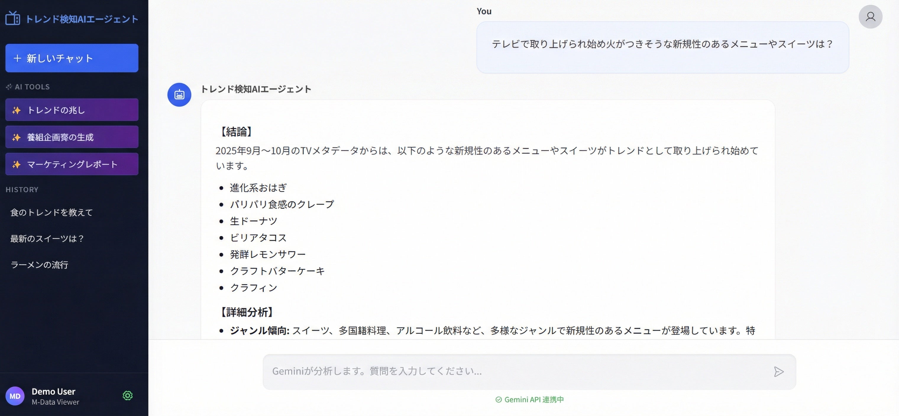 テレビの放送内容をテキスト化した「TVメタデータ」を提供する 株式会社エム・データ(本社:東京都千代田区、代表取締役社長:薄井 司、以下「エム・データ」)は、東京大学発のAIスタートアップ企業である株式会社2WINS(本社:東京都文京区、代表取締役CEO:小川椋徹、以下「2WINS」)と共同で、生成AIにTVメタデータを学習・解析させ、テレビで話題のモノ・コトに関するトレンド予兆をタイムリーに検知し、新商品やメニューの企画立案が可能なAIエージェント「トレンド検知AIエージェント」の開発に着手しました。