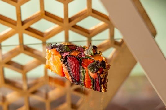 マリネしたスモークサーモンに、ビーツ、赤パプリカ、ほうれん草、焼き海苔を重ね、モザイク状に仕立てた彩り豊かなテリーヌ。見た目の美しさとともに、素材それぞれの風味とスモークの香りの重なりを楽しめる一品です。