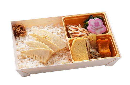 たけのこを乗せただし炊き込みご飯に、桜えび入りのだし餡をたっぷりとかけた豆腐ハンバーグや、菜の花のからし和えなどだしをきかせたおかずを詰め合せた春季限定のお弁当です。