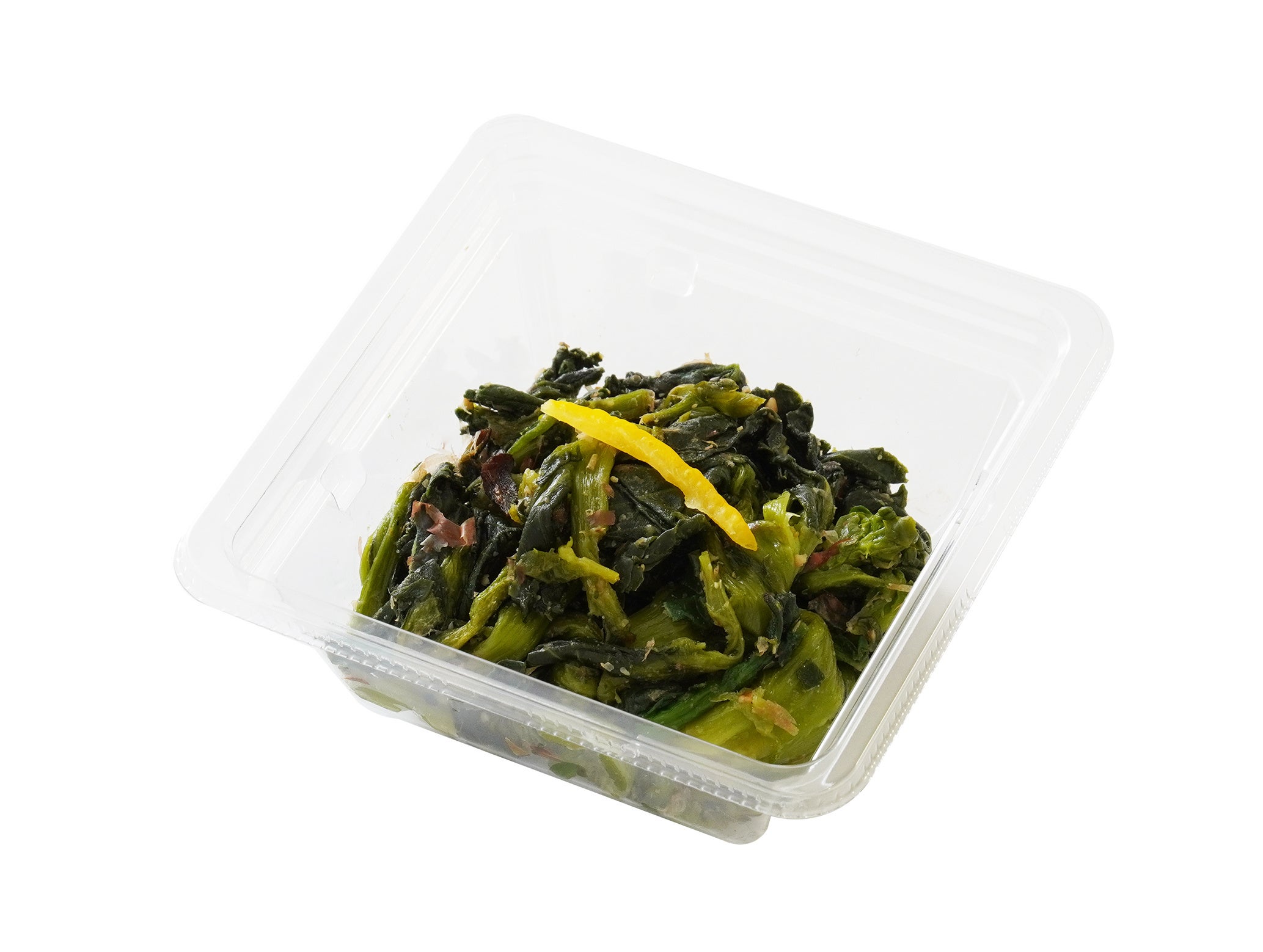 白だしで下味をつけた菜の花のからし和えです。混ぜ込んだかつお節の旨みとピリッとした辛さがクセになる味わいです。
