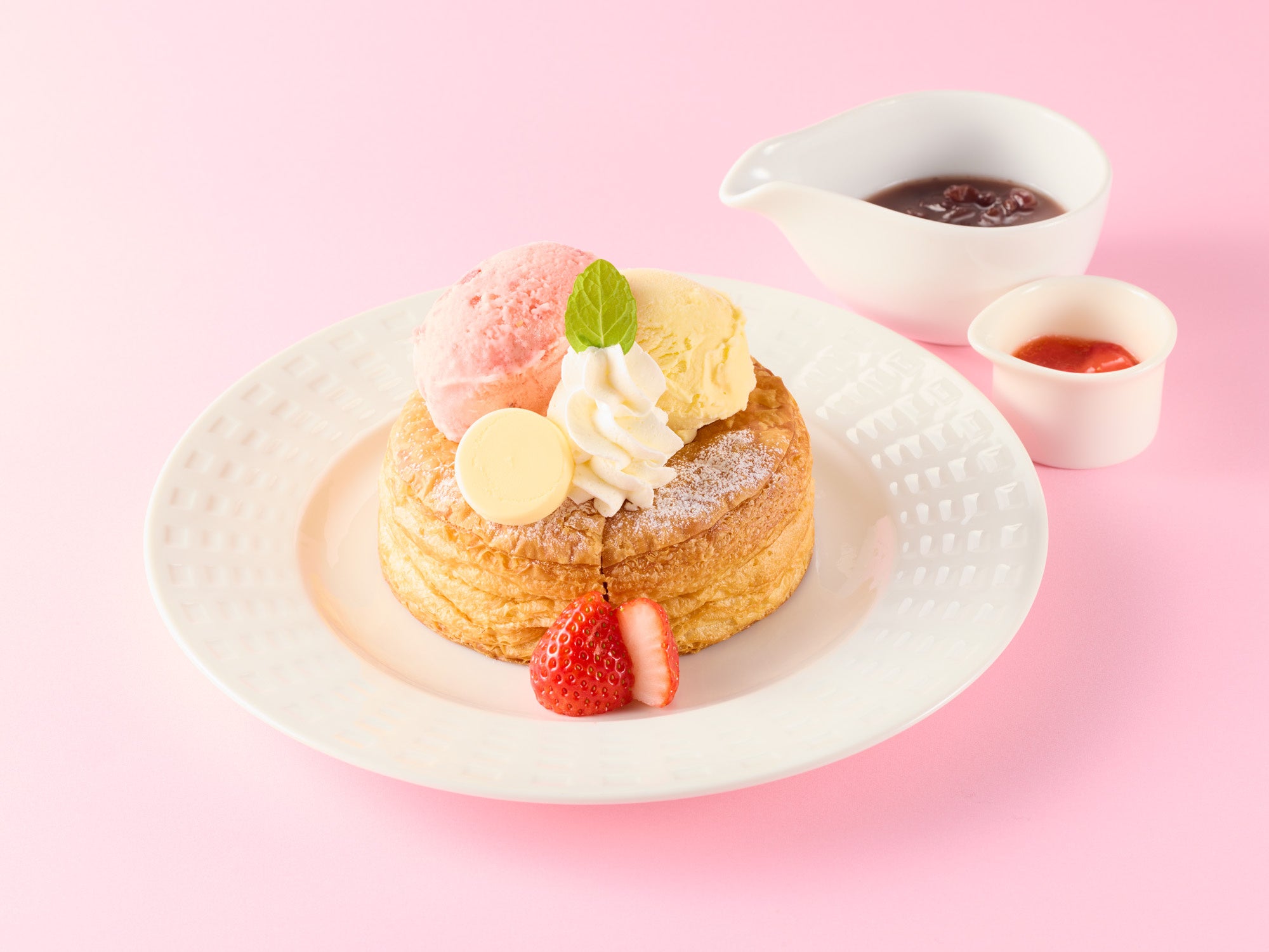 別添えの温かいあんこをかけていただくと、バターが溶けて甘みとコクが調和した絶妙な味わいをご堪能いただけます。果肉入りいちごソースで甘酸っぱさをプラスして、味の変化もお楽しみください。