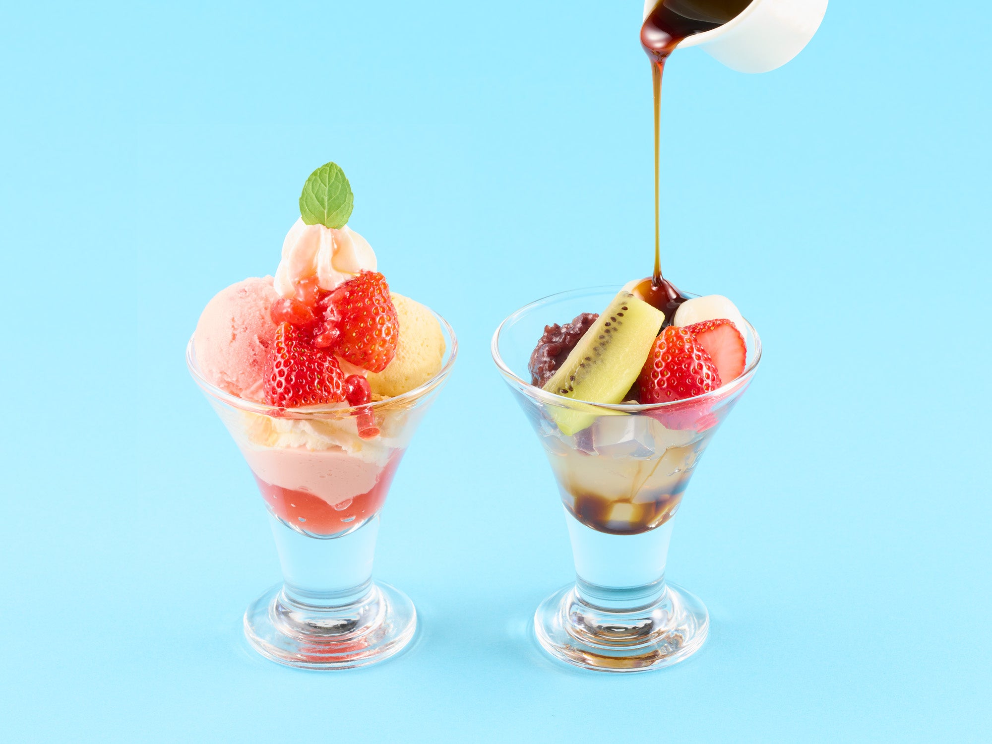 (画像左)ミニ!いちごのパフェ/(画像右)ミニ!いちごのあんみつ