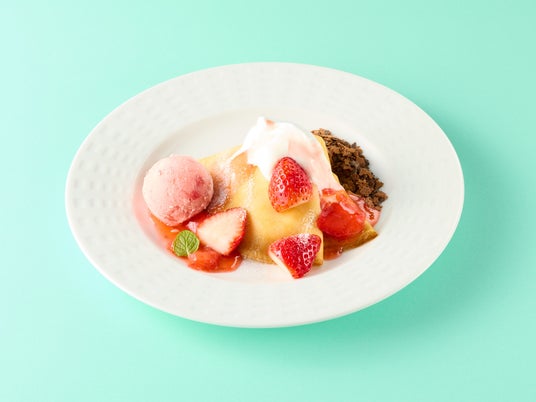 72層に重なったほんのり甘いデニッシュ生地が特長の“ココッシュ”に、いちごやいちごシャーベット、バニラアイスなどをたっぷりトッピングしました。
