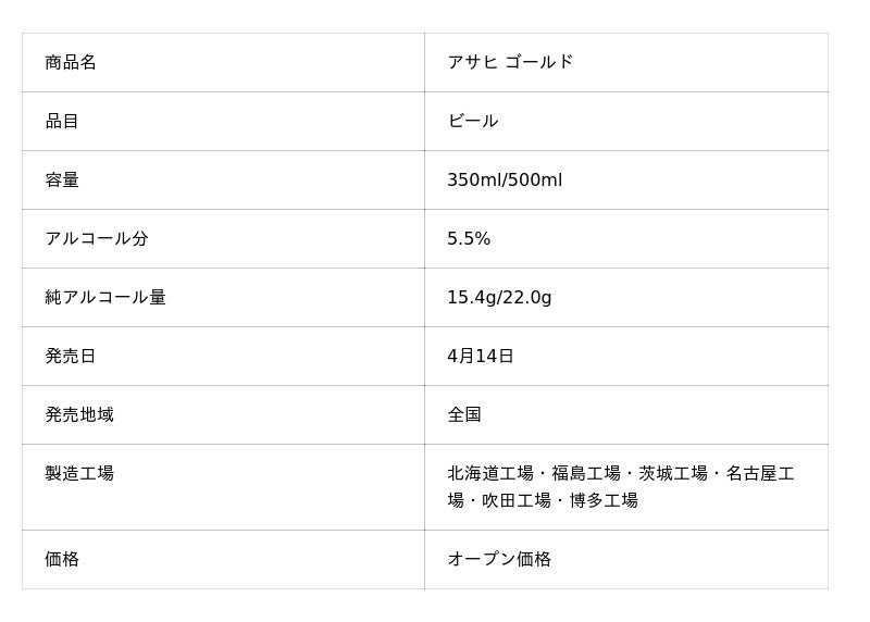 アサヒビール株式会社(本社 東京、社長 松山一雄)は、麦芽100%のスタンダードビールとして9年ぶりの新ブランド※『アサヒ ゴールド』を4月14日から発売します。
