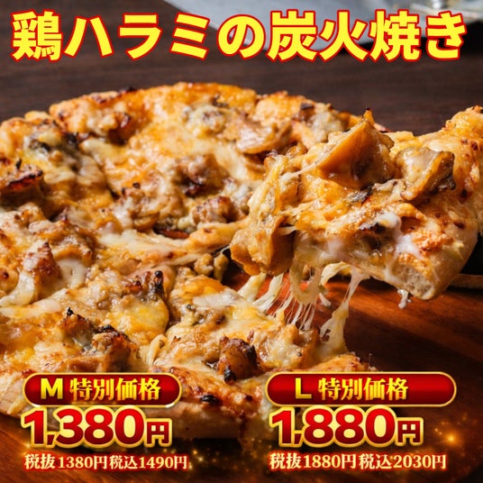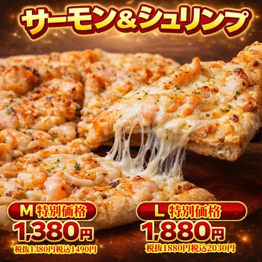 第二弾(2026年3月1日~5月31日)では、新商品「山盛りチーズのホワイトソース」をはじめ、「マルゲリータ」「サラミ&ソーセージ」もM980円/L1,480円(税抜)の特別価格に。さらに「サーモン&シュリンプ」「鶏ハラミの炭火焼き」は、M1,380円/L1,880円(税抜)で販売します。