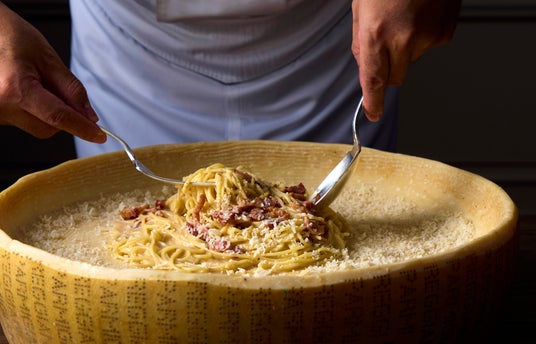 チーズを溶かしながら仕上げる「ホールチーズで仕上げるスパゲッティ・カルボナーラ」