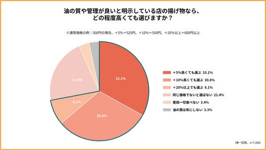 油の質や管理が良いと明示している店の揚げ物について、約72%が価格プレミアム(=相場より高くても選ばれる上乗せ分)を許容すると回答しました。