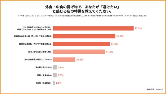 外食・中食の揚げ物で「避けたい店」の特徴として、以下が上位に挙がりました。パック内の衣がべちゃついている・油が染み出している: 73.5%
