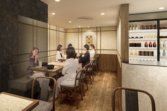 店装は韓国の路地の家屋をイメージしつつ、ターゲットである大人女子が居心地の良さを感じていただけることを念頭にデザインしました。また、一部の客席には地元岡山の名産であるデニムを模した材質を用いています。スタッフのユニフォームもデニムを採用。カトラリーの箸袋等にもデニムをイメージしたインディゴブルーをデザインカラーに活かしています。