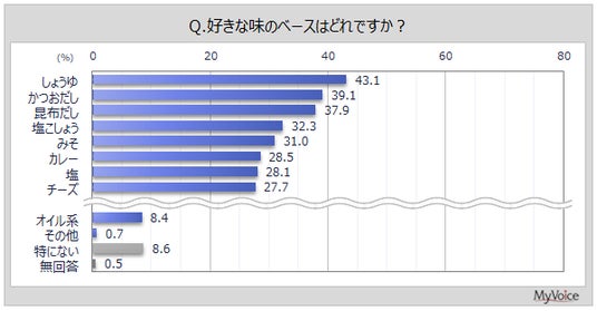 好きな味のベースは(複数回答)、「しょうゆ」が43.1%、「かつおだし」「昆布だし」が各4割弱、「塩こしょう」「みそ」が各3割強です。