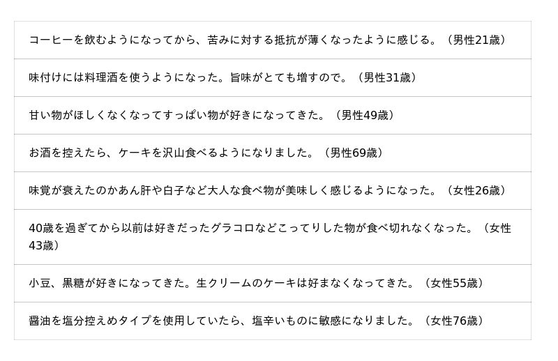 好きな味や苦手な味、嗜好の変化などについて聞いています。調査結果をお知らせいたします。