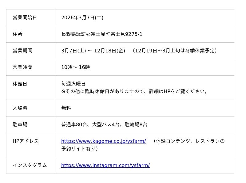 「カゴメ野菜生活ファーム富士見」は、2019年4月、遊休地を活用し、八ヶ岳の雄大な自然に囲まれた富士見町に開業しました。2025年度は年間約4万人のお客さまに来場いただき、野菜の収穫や工場見学を通じて農業・工業への興味・関心を培うとともに、野菜を通じて地域活性の拠点としての役割を担っています。【営業関連情報】